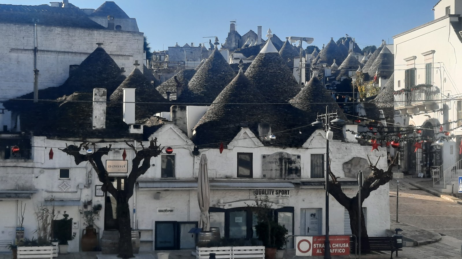 Había dos barrios: Rione Monte con 1000 trullis, y Aia Piccola con 400 trullis. El conjunto era un bosque de tejadillos cónicos más oscuros y chimeneas en las blancas calles. Algunas calles tenían plantas y macetas con flores. Lo visitamos en diciembre de 2021, con cielos azul intenso, sol y temperatura de 10º. Todavía había restricciones por la pandemia y se veía poco turismo.